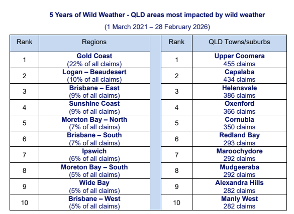 - Queensland recorded 40,300 wild weather claims between 1 March 2021 and 28 February 2026, made up of 31,534 home claims and 8,766 motor claims.